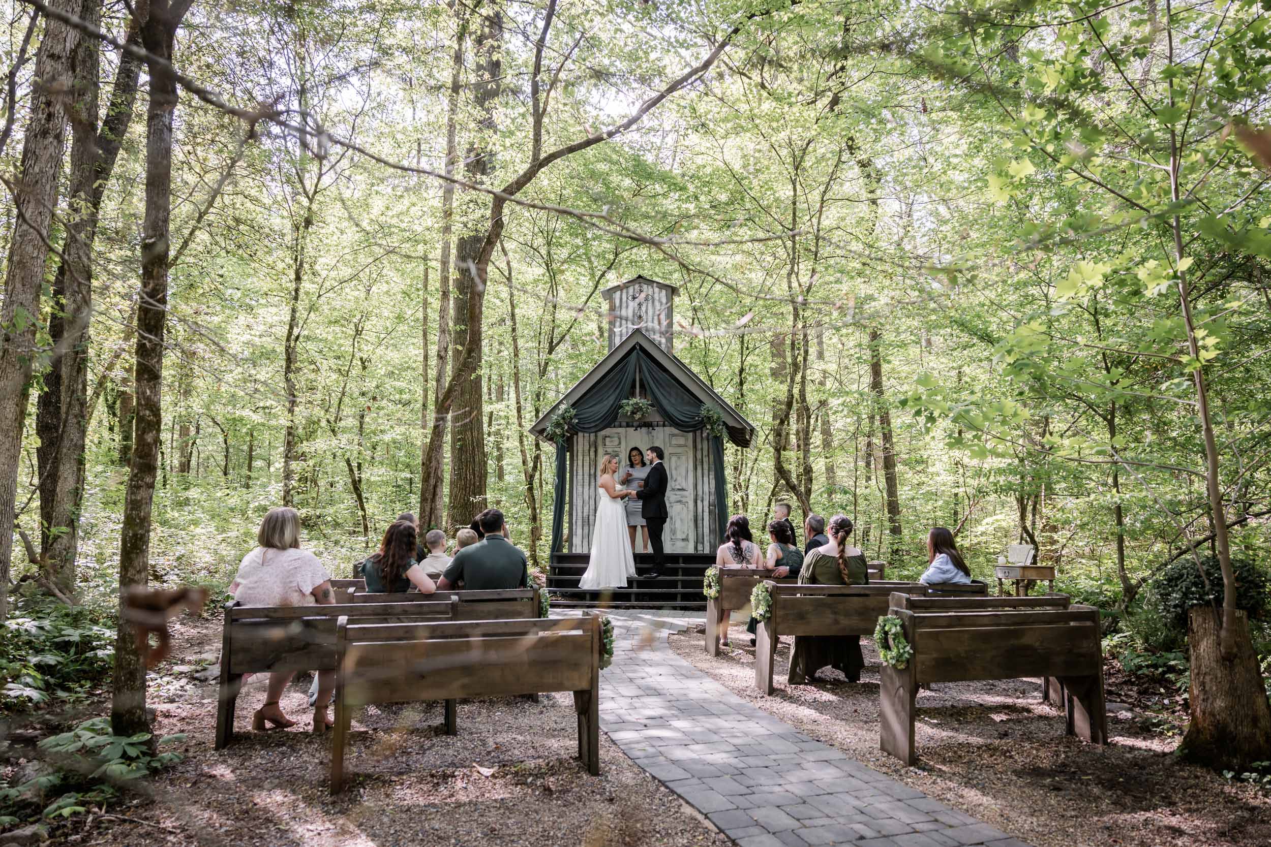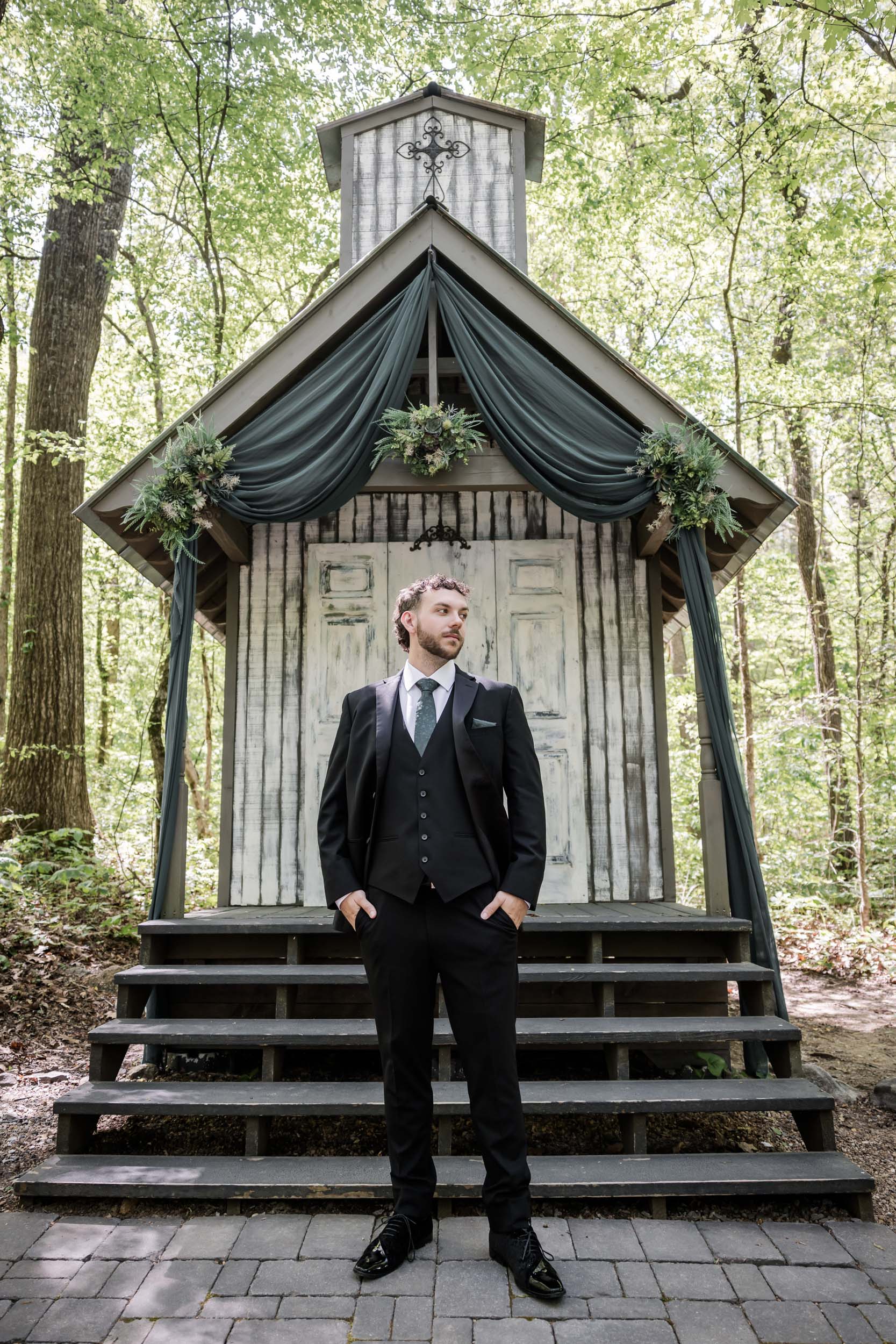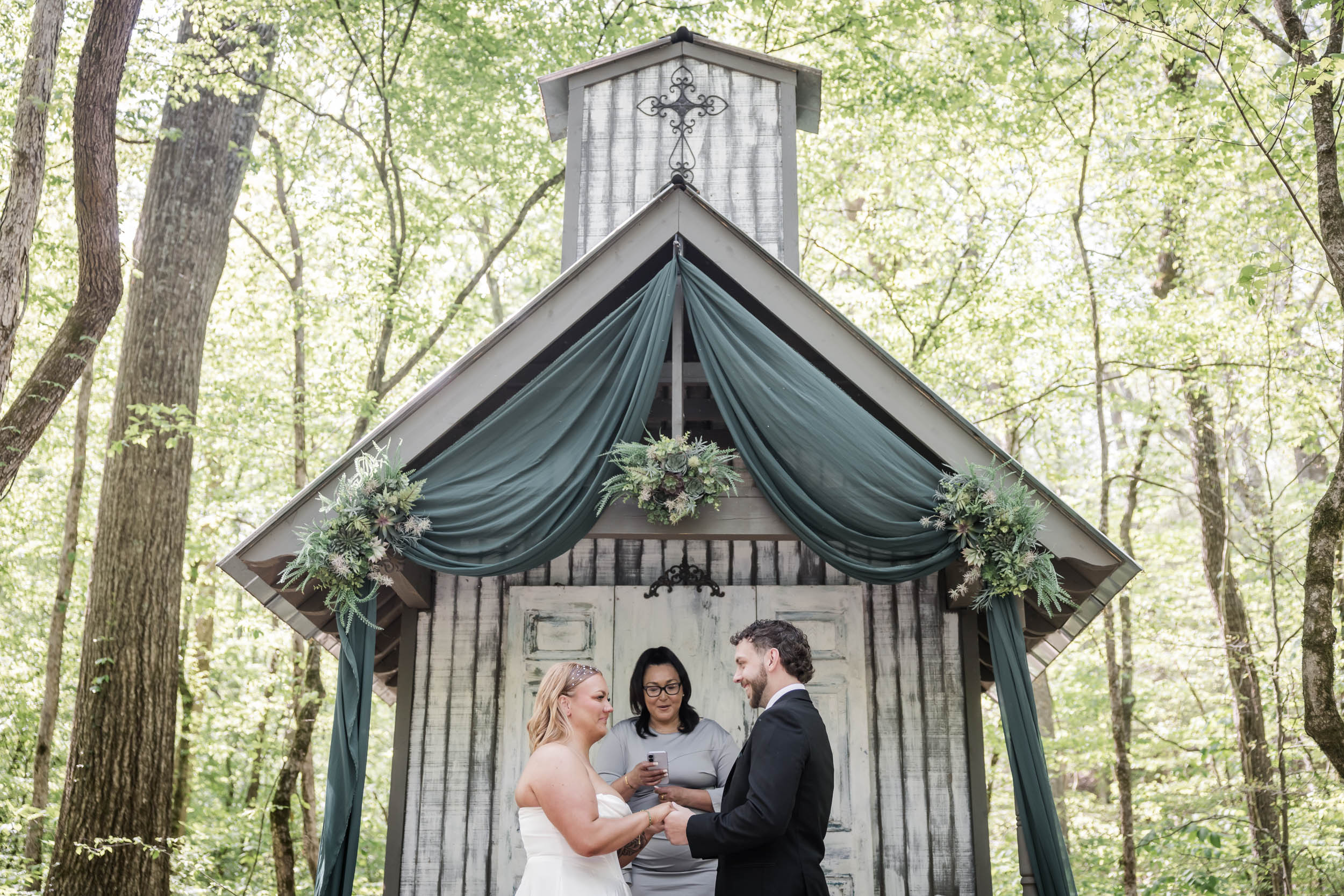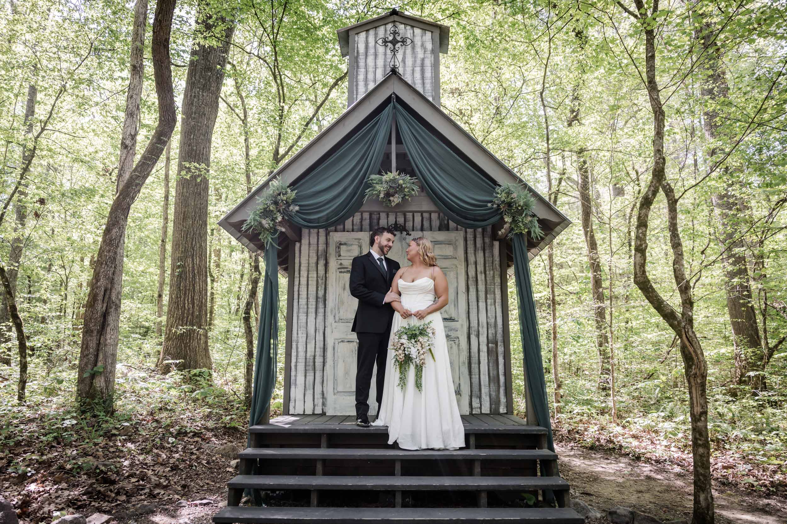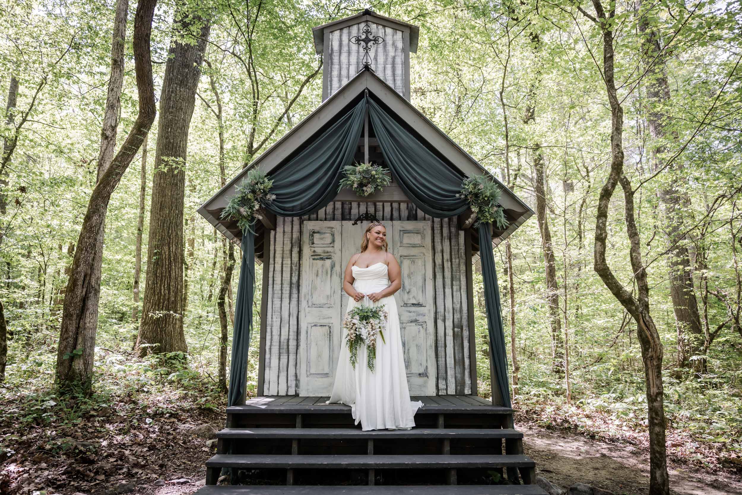 Located just outside the Great Smoky Mountains National Park, Chapel in the Hollow offers couples a serene woodland setting without the stress of permits or restrictions. Becca and Cory chose to lean into that natural beauty, styling the chapel with rich hunter green fabric paired with succulent florals and wreaths.
