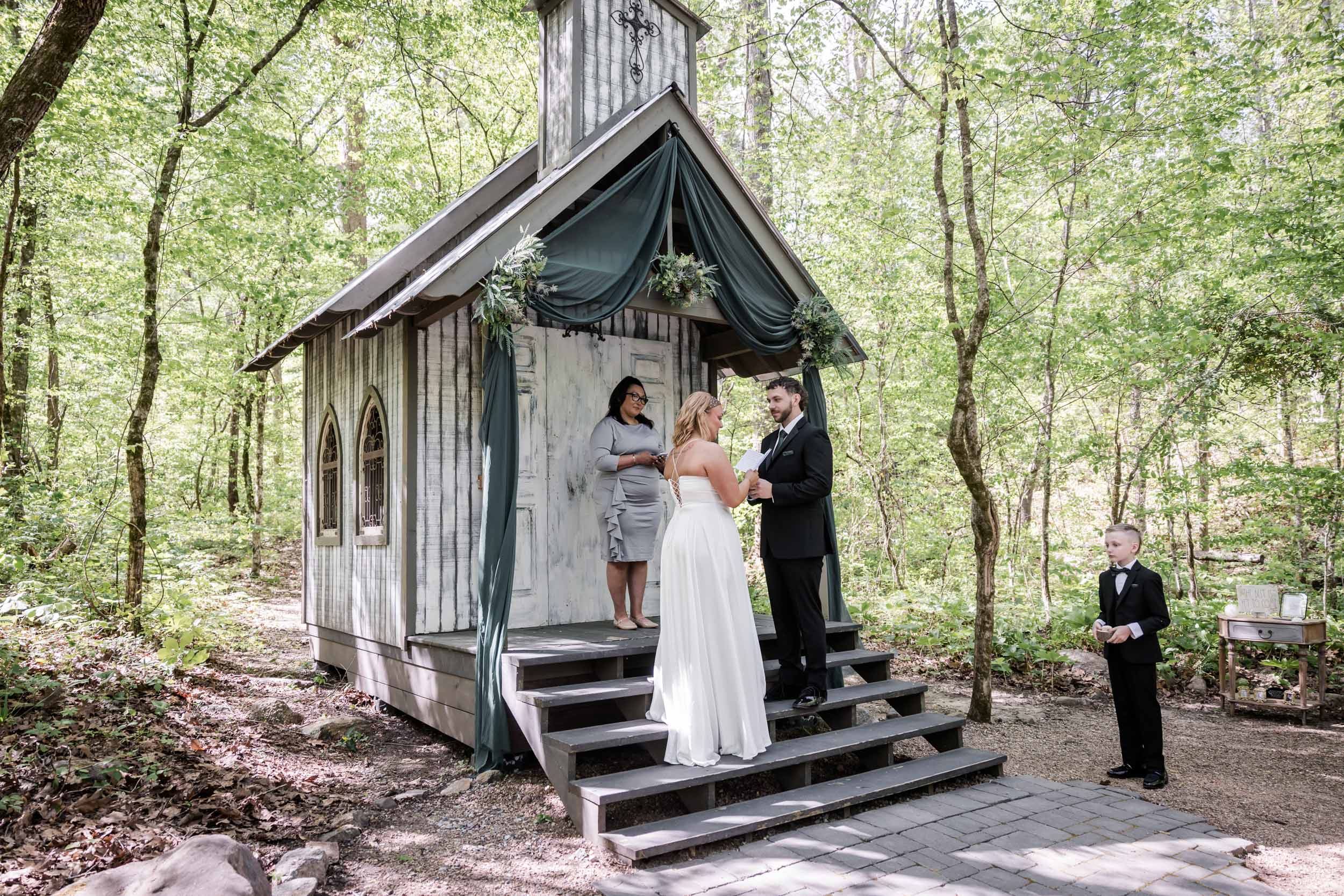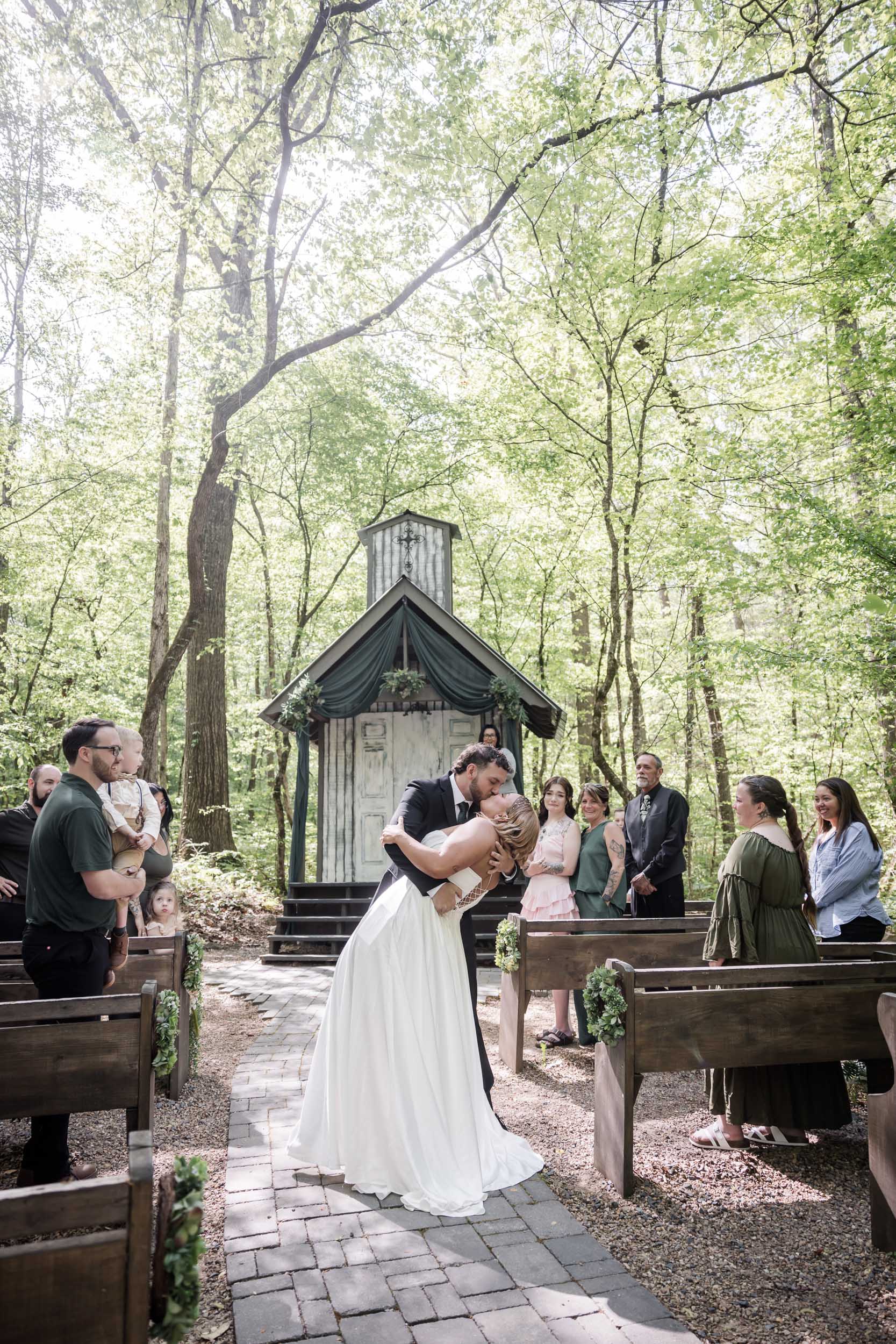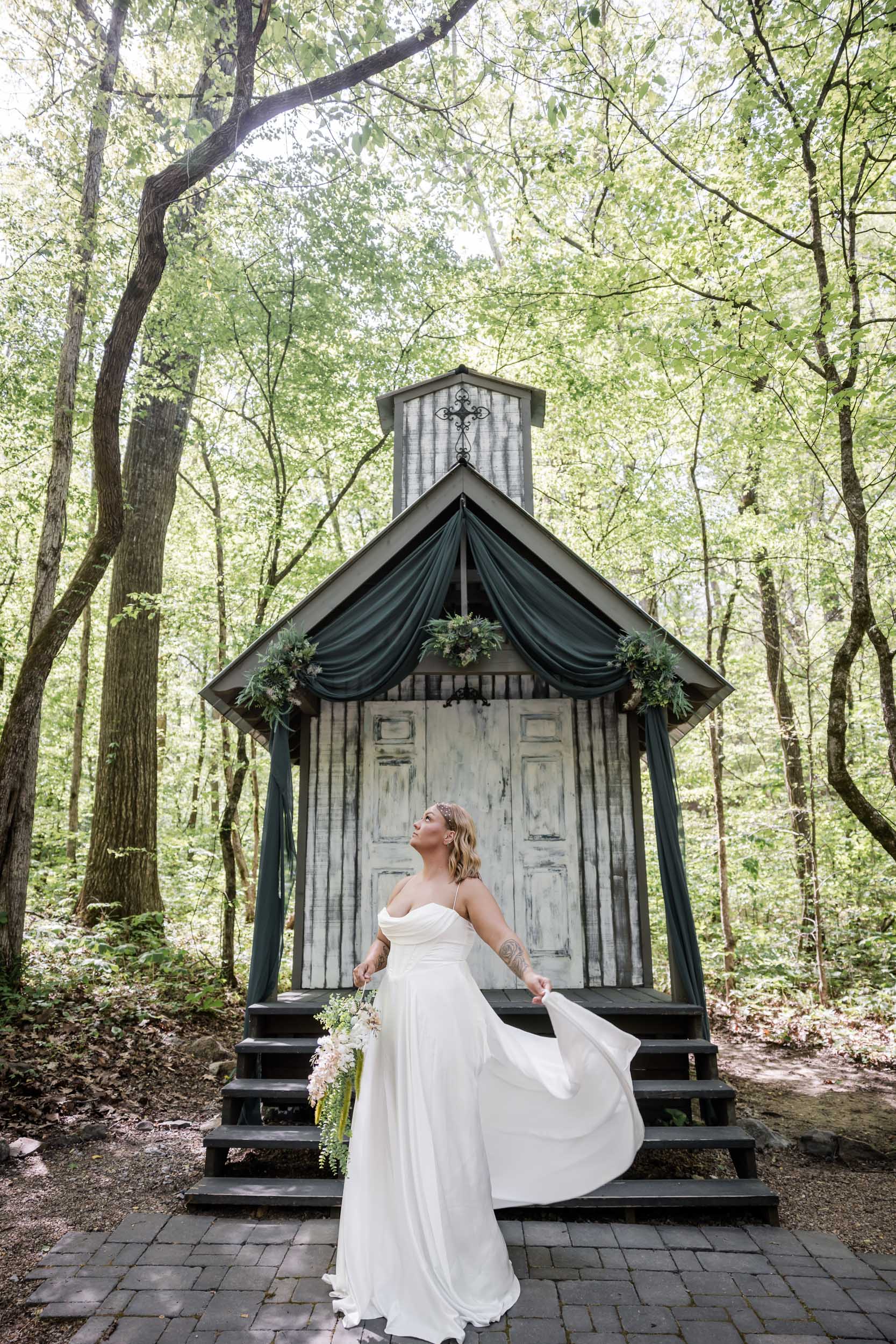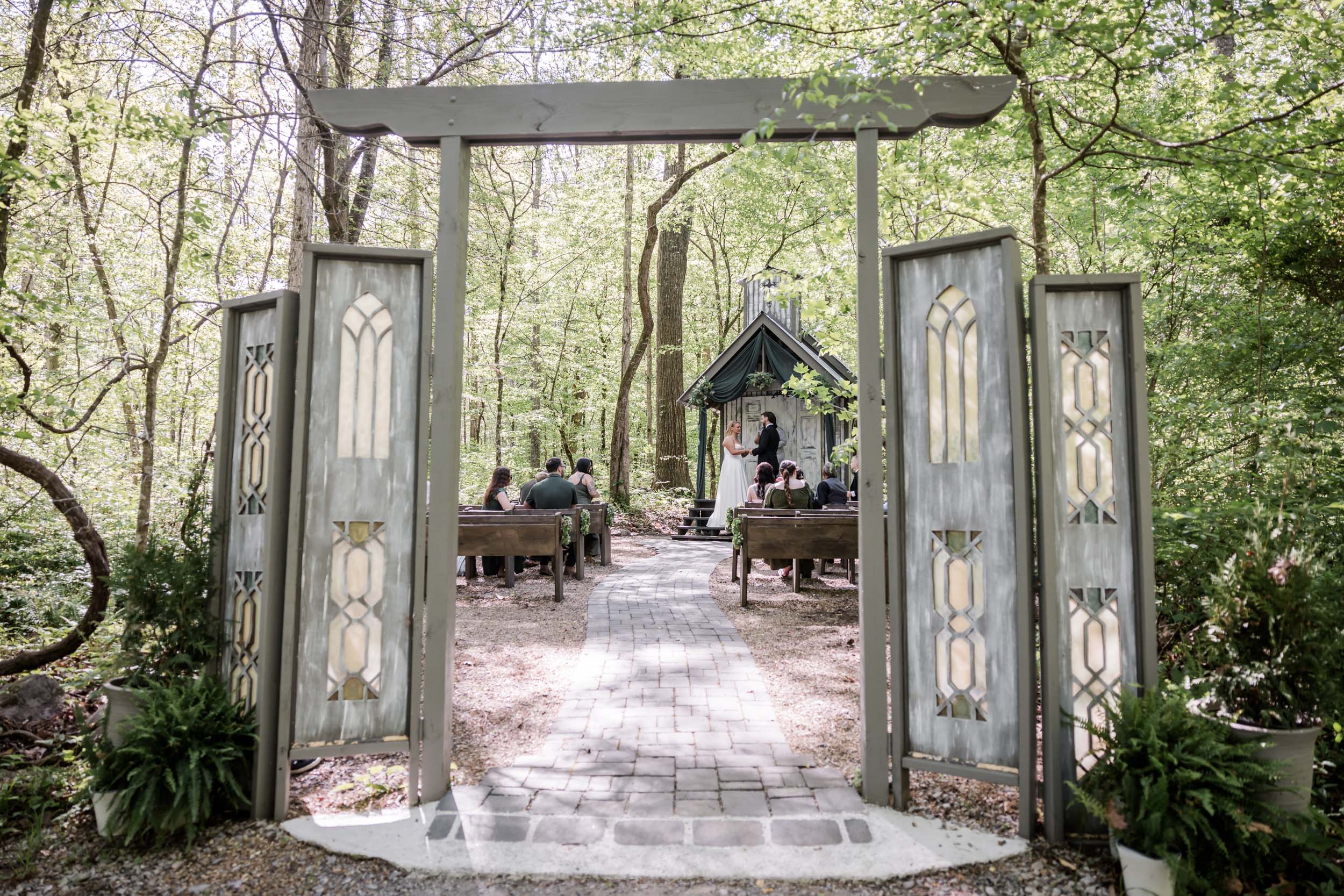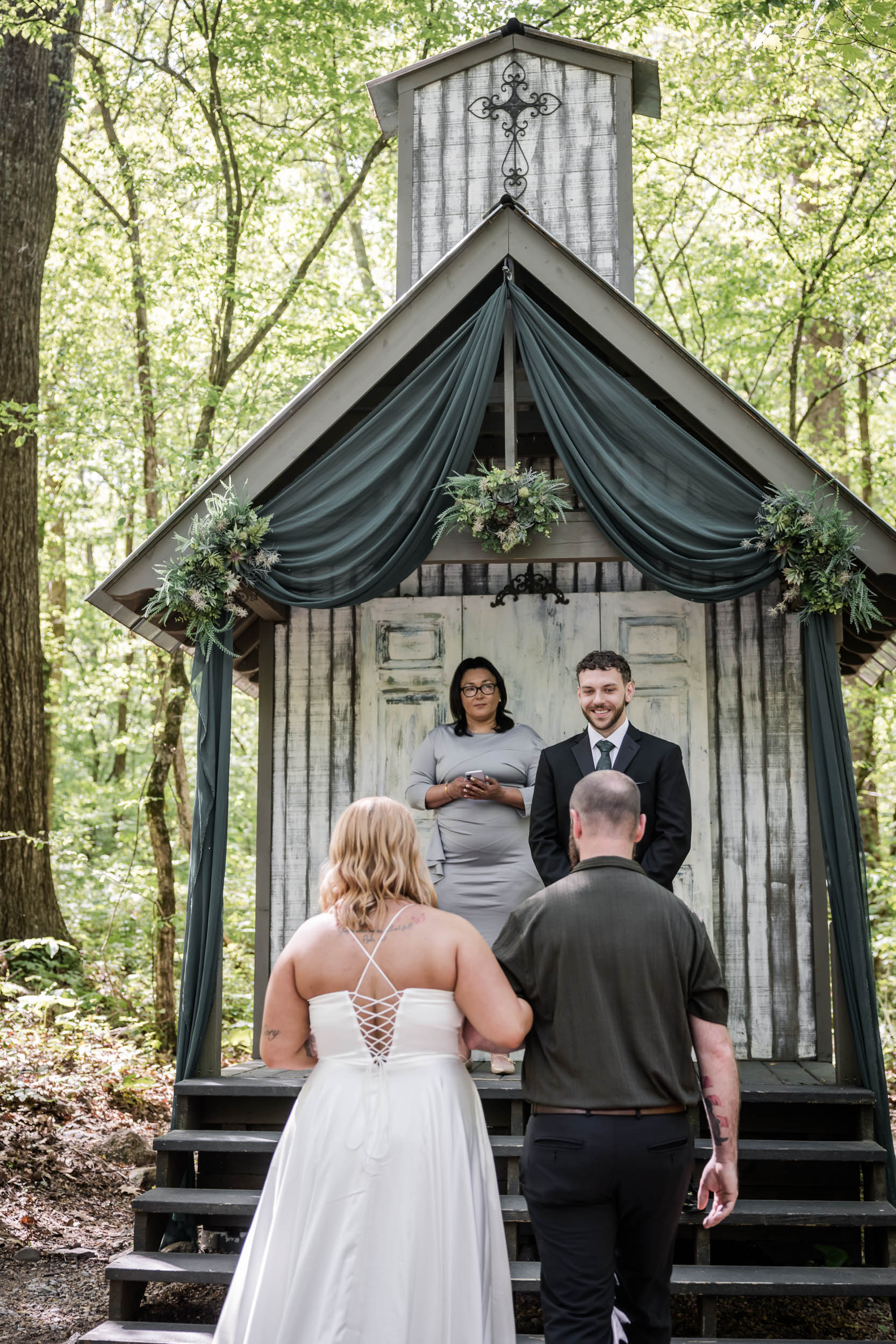Located just outside the Great Smoky Mountains National Park, Chapel in the Hollow offers couples a serene woodland setting without the stress of permits or restrictions. Becca and Cory chose to lean into that natural beauty, styling the chapel with rich hunter green fabric paired with succulent florals and wreaths.